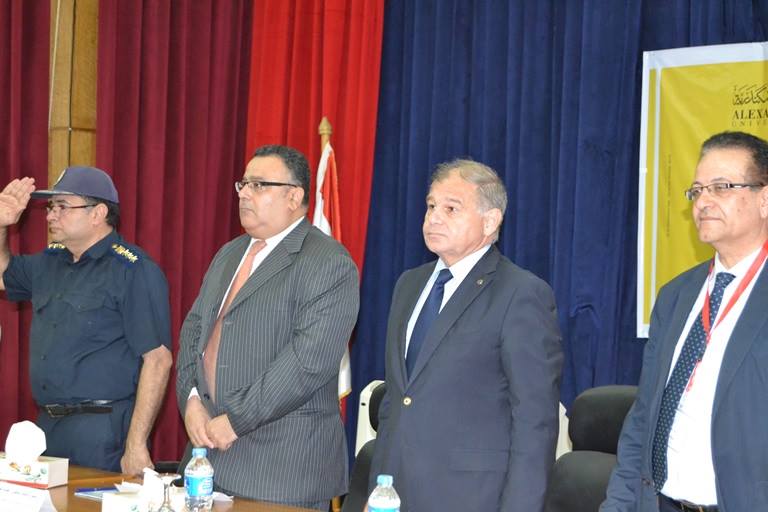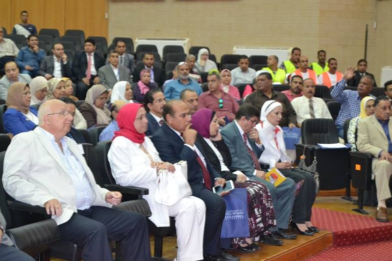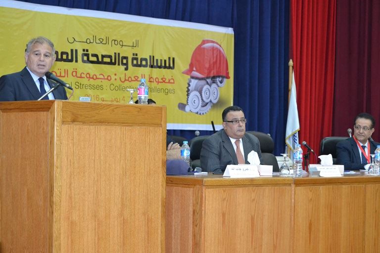 واكد م. فرج سيدهم فى كلمته نائبا عن وكيل وزارة القوى العاملة على ضرورة التعاون الكامل بين الجهات الحكومية ممثلة في إدارة السلامة والصحة المهنية بالقوى العاملة وادارة شئون البيئة وادارة الدفاع المدنى والحريق والمحليات والجهات العلمية خاصة المعهد العالي للصحة العامة بجامعة اﻻسكندرية لوضع سياسة موحدة تليق بالسلامة والصحة المهنية.