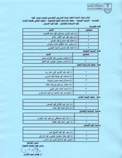 تم الإعلان عن أسماء أعضاء هيئة التدريس المتقدمين لمنصب عميد الكلية لكليات ( الهندسة - التربية النوعية - معهد الدراسات العليا والبحوث - المعهد العالى للصحة العامة - السياحة والفنادق - طب الأسنان ).