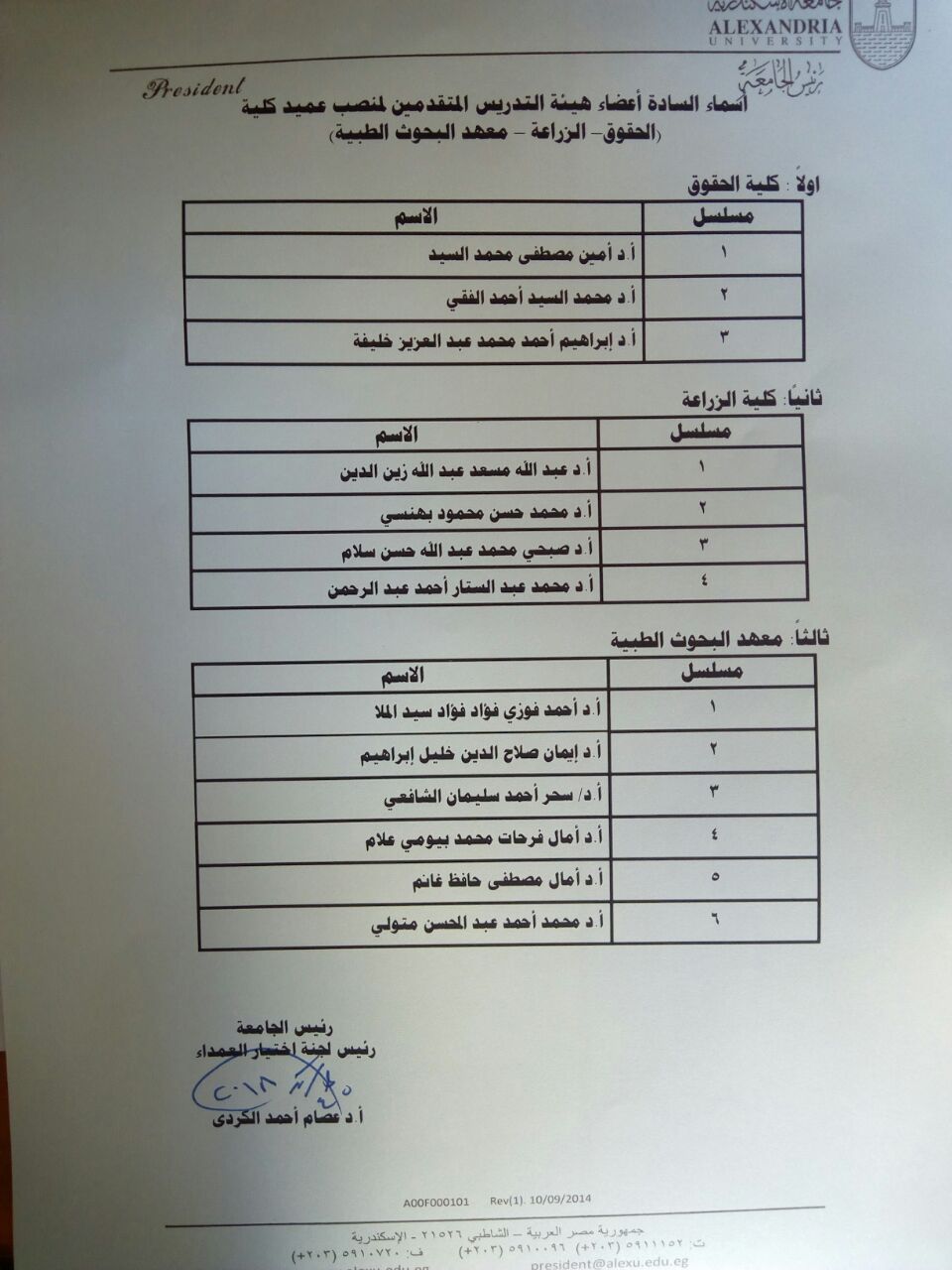 أسماء السادة أعضاء هيئة التدريس المتقدمين لمنصب عميد كلية (الحقوق - الزراعة - معهد البحوث الطبية)