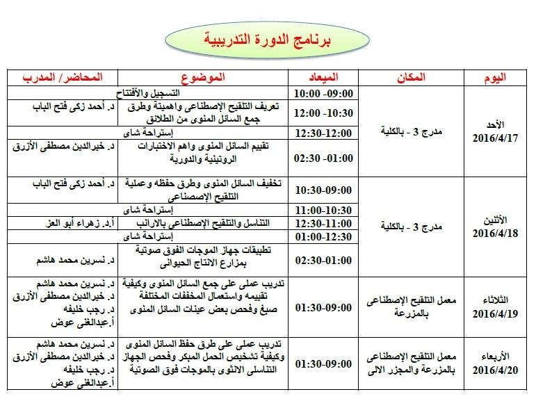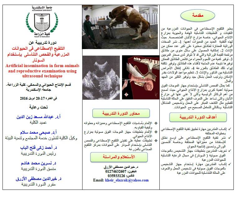 تحت رعاية أ.د. عبد الله مسعد زين الدين عميد كلية الزراعة يقيم قسم الانتاج الحيوانى والسمكى بالكلية دورة تدريبية عن " التلقيح الاصطناعى فى الحويانات المزرعية وفحص التناسلى باستخدام السونار " وذلك فى الفترة من 17 : 20 ابريل الجارى .