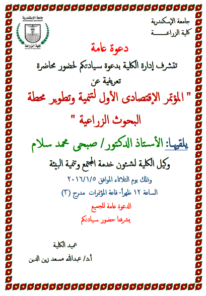 "تتشرف إدارة الكلية بدعوة سيادتكم لحضور محاضرة تعريفية عن "المؤتمر الاقتصادى الاول لتنمية وتطوير محطة البحوث الزراعية