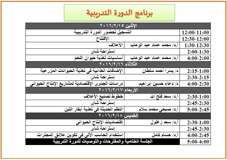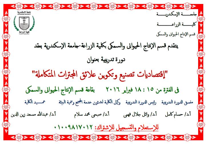 تنظم كلية الزراعة جامعة الاسكندرية خلال الفترة من 15 إلى 18 فبراير 2016 دورة التدريبية عن اقتصاديات تصنيع وتكوين علائق المجترات المتكاملة، وذلك تحت رعاية الأستاذ الدكتور عبد الله مسعد زين الدين، عميد الكلية والأستاذ الدكتور صبحي محمد سلام، وكيل الكلية لشئون خدمة المجتمع وتنمية البيئة والأستاذ الدكتور وائل جلال فهمي رئيس قسم الانتاج الحيواني والسمكي والأستاذ الدكتور حسام كامل، منسق الدورة التدريبية .