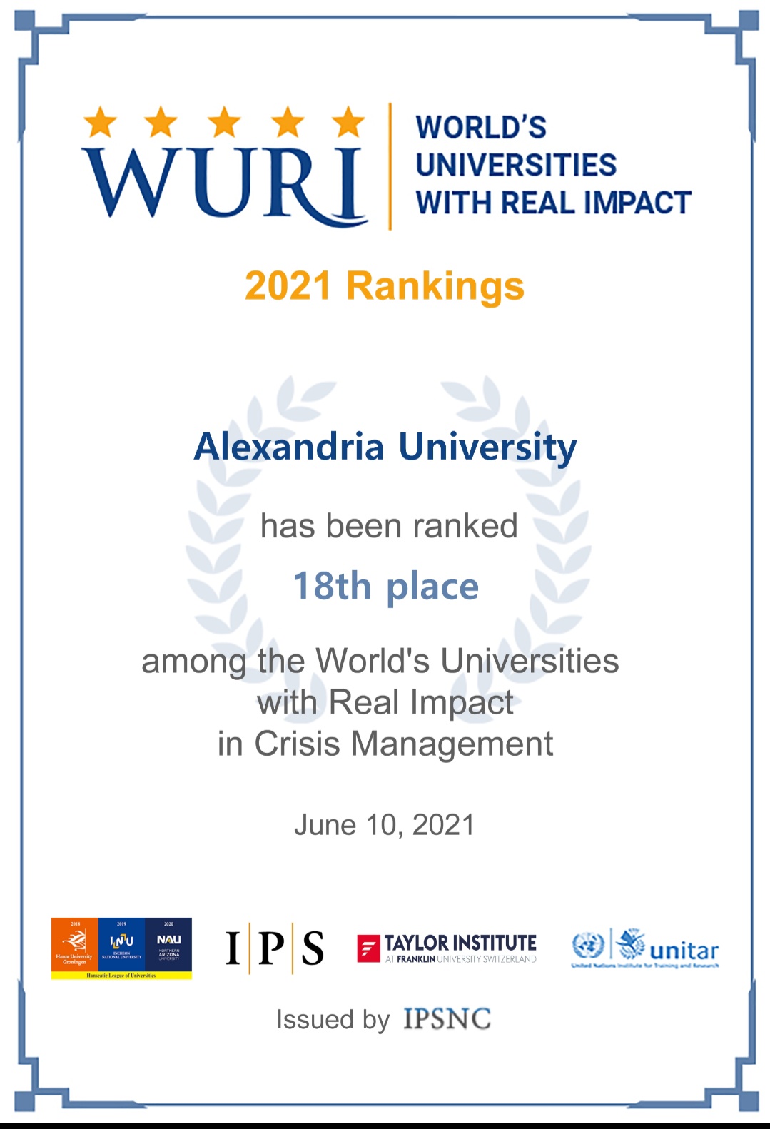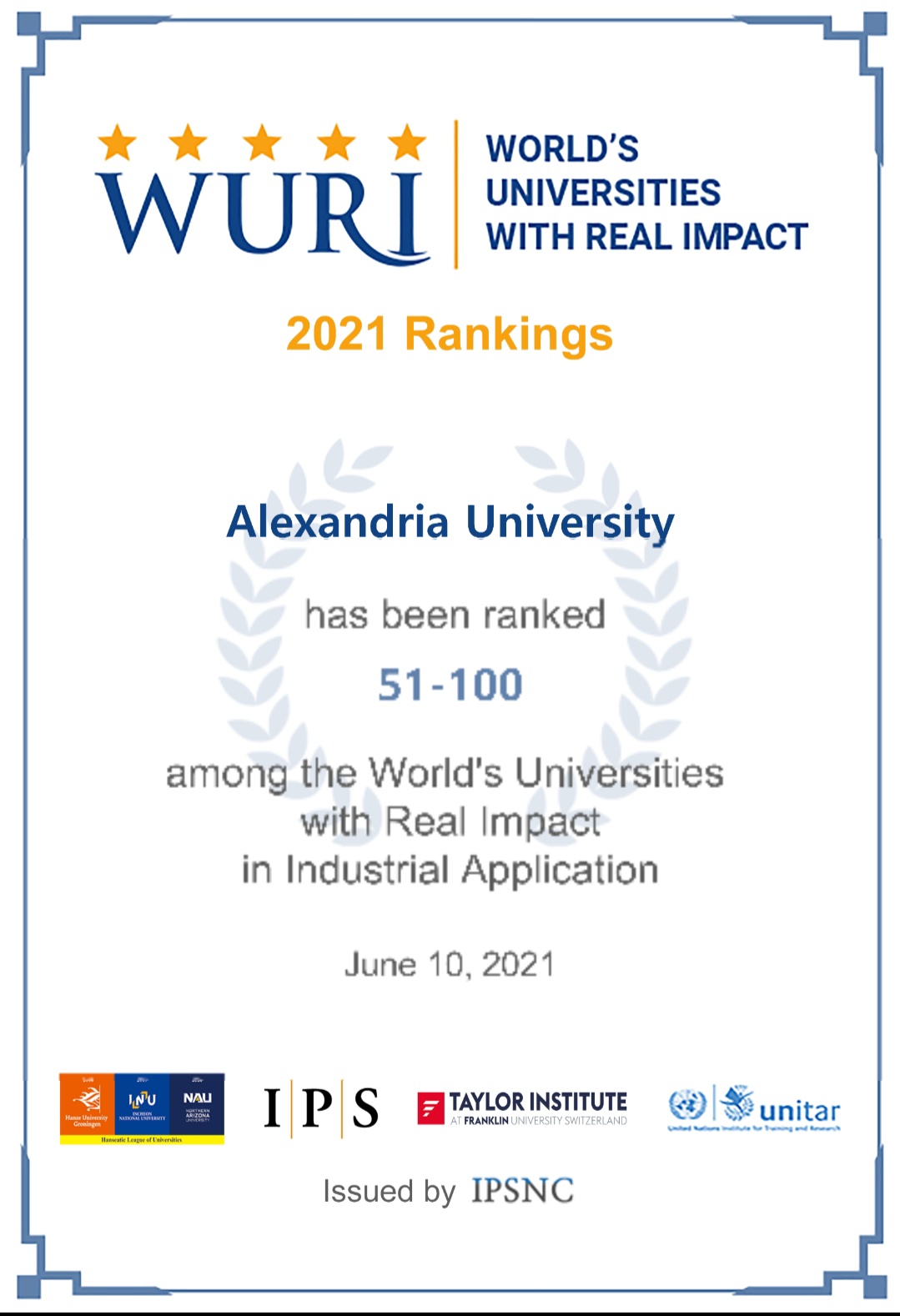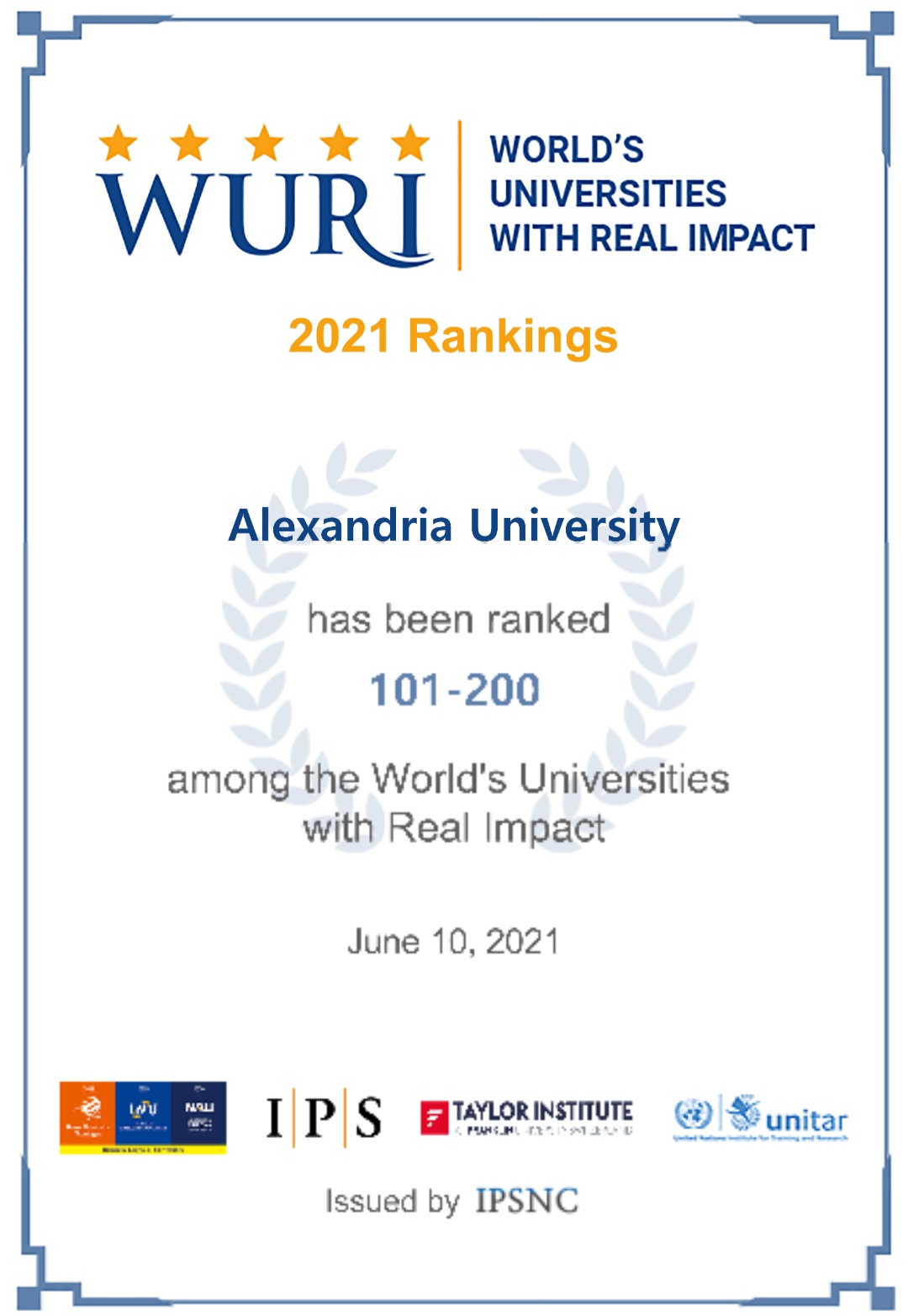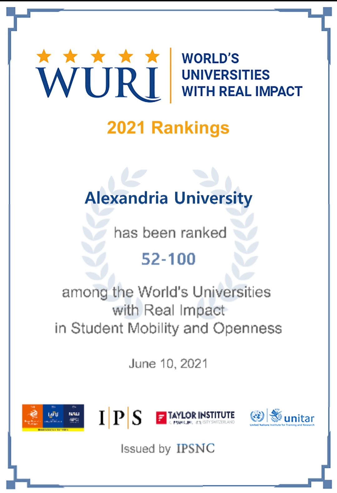 Dr. Abdelaziz Konsowa, President of Alexandria University, stated that the result of the World Universities Ranking with Real Impact (WURI) for the year 2021 has been announced, as Alexandria University was listed in (101-200). At the level of universities in the world with a real impact, the university was distinguished in a number of creative approaches. The innovation of research and university education ranked No. 18 in "crisis management", and in the slide (51-100) in "industrial applications", and ranked (52-100) in "student mobility and openness".