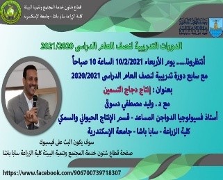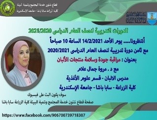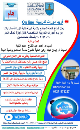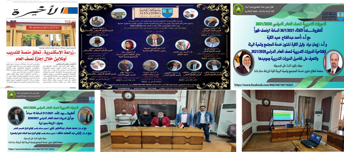 برنامج الدورات التدريبية خلال أجازة نصف العام الدراسي 2021 في تخصصات الكلية للتأهيل لسوق العمل والمشاريع ومقترح أنشطة الترم الثاني للعام الجامعي 2020/2021 وتم مراسلة السادة رؤساء الأقسام العلمية لمشاركة الأقسام مع تجديد فورمة للمشاركة وتم عمل فورم لتسجيل المتدربين أونلاين وتم الإعلان عن الدورات بإعلان ورقى وإلكترونى وعمل برومو عن إفتتاح الدورات والتعريف بها الثلاثاء 24/1/2021 لايف على صفحة قطاع خدمة المجتمع كلية الزراعة ساباباشا